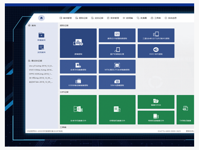 檢材固定、檢材預檢、手機檢驗、監控視頻、數據檢驗、數據匯聚、證據存儲、檢測流程等功能區域。